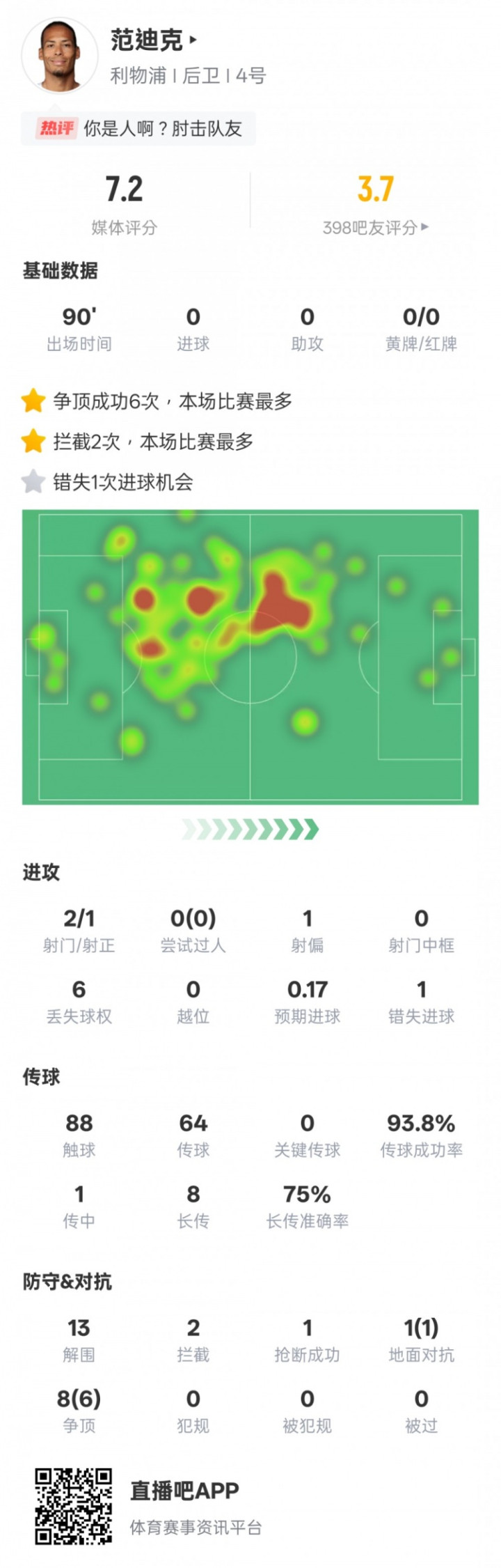 直播吧10月20日讯2025-26赛季英超第8轮焦点战,利物浦主场1-2曼联。范迪克首发出战,6次争顶成功全场最多,还有13次解围和2次拦截,错失1次进球机会,评分7.2。
