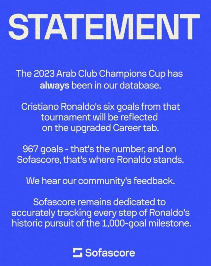 Sofascore的公告写得很直接。“2023年阿拉伯俱乐部冠军杯的赛事数据一直收录在我们的数据库中。C罗在该项赛事中打进的6粒进球,现已同步更新至我们升级后的‘职业生涯’版块。967球,这是目前的数字,也是C罗在Sofascore上的最新进球总数。” 这段话翻译过来就是:我们之前漏了,现在补上了,你们别骂了。