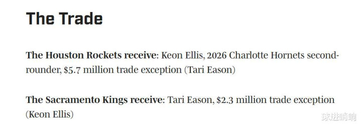 火箭得到:基恩-埃利斯+26年黄蜂二轮签+570万交易特例;