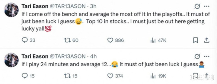 伊森在社媒写道:“我场均24分钟拿下12分是运气,在季后赛作为替补场均得分最高,场均抢断与盖帽都排在前十,也都是运气好!”