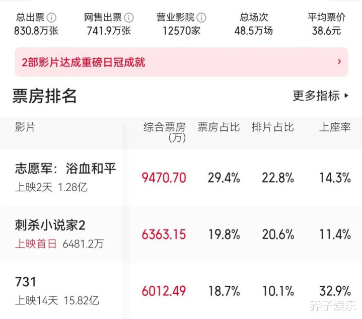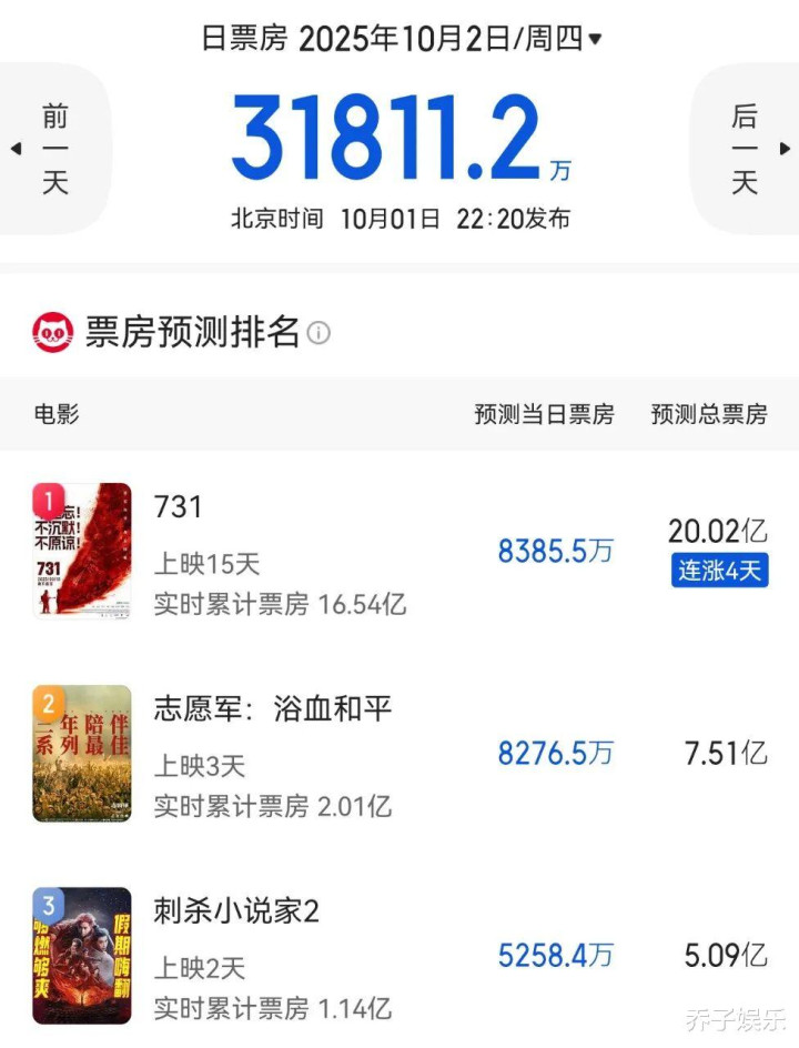 国庆第一天,《731》也没想到吧,以仅10.1%的排片砍下了18.7%,上座率直接断层第一,票房预测直接给大幅上调至20亿,远超预期!