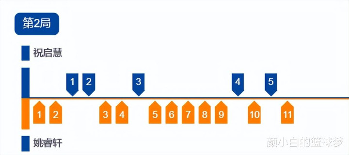 第二局开场姚睿轩2-0领先,祝启慧追到2-2后,姚睿轩4-2再度拉开,姚睿轩一波流拉开到9-3,姚睿轩11-5扳平大比分。
