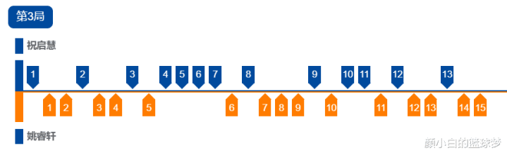 第三局开场两人又是2-2,姚睿轩4-2领先,随后5-3继续领先,但祝启慧连续得分7-5反超,祝启慧8-6领先,姚睿轩连拿3分反超,姚睿轩10-9率先拿到局点,祝启慧挽救一个局点后反超,姚睿轩又挽救局点,两人12-12,祝启慧又挽救局点,最终还是姚睿轩15-13拿下。
