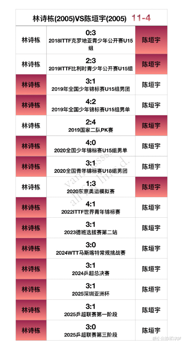 林诗栋VS陈垣宇11胜4负;