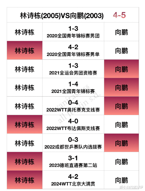 林诗栋VS向鹏4胜5负;