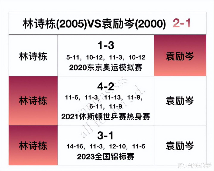 林诗栋VS袁励岑2胜1负。林诗栋与这7人的交手只有面对向鹏是劣势,其余的不是均势就是优势,战绩合计是37胜16负,这足以说明林诗栋就是同期中最强的存在。