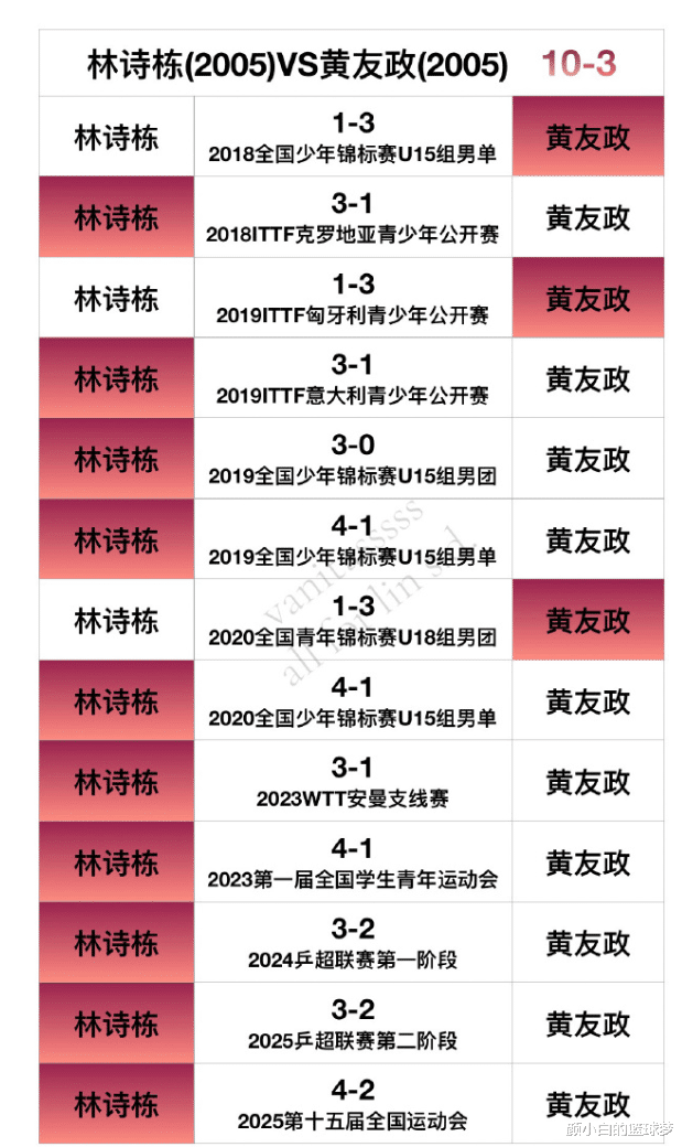 林诗栋VS黄友政10胜3负;
