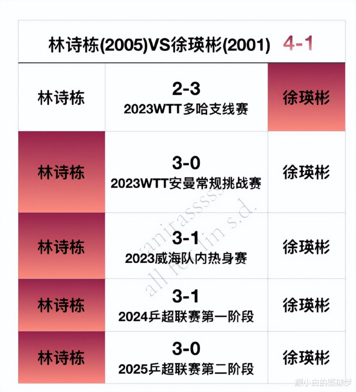 林诗栋VS徐瑛彬4胜1负;
